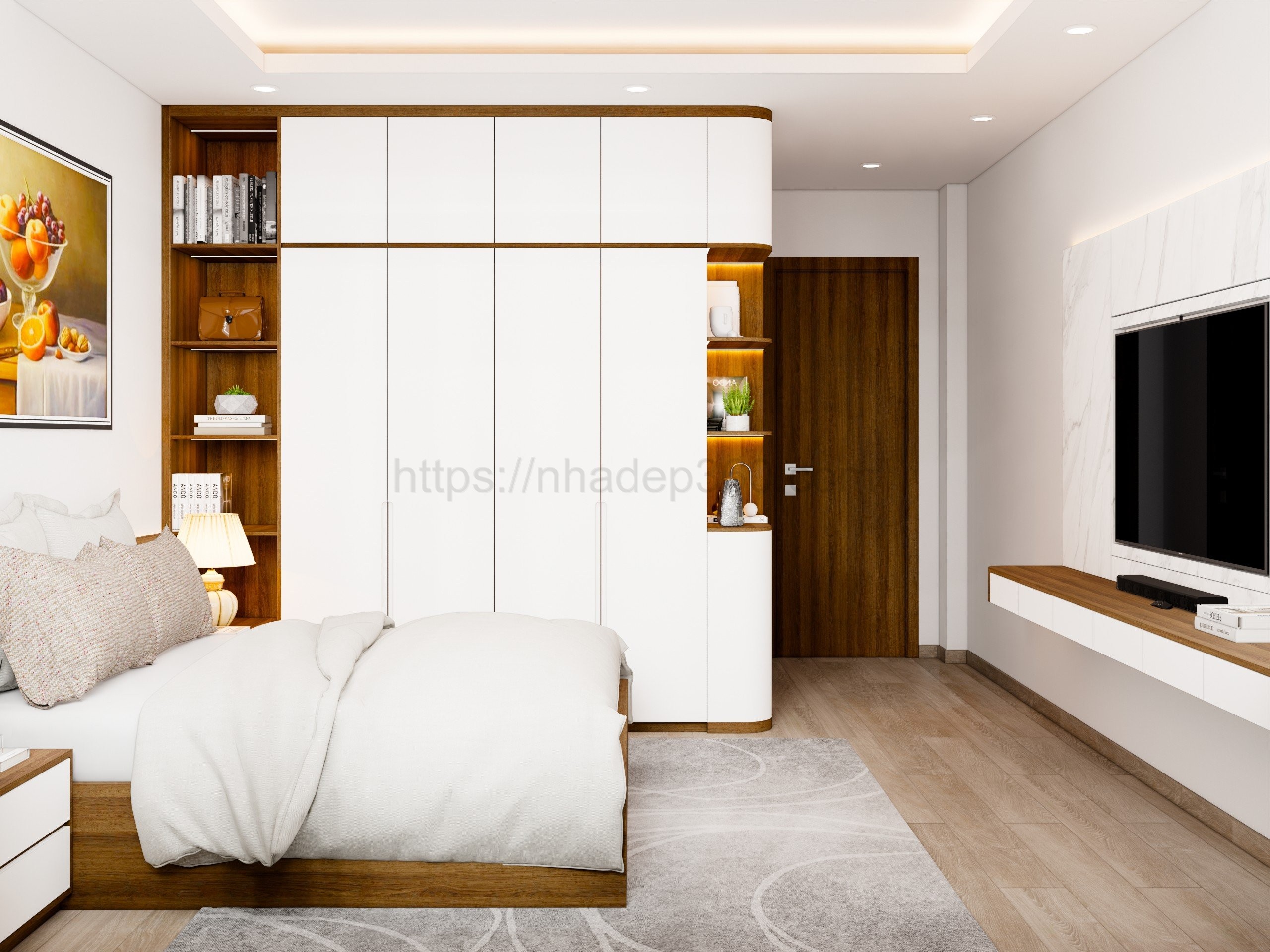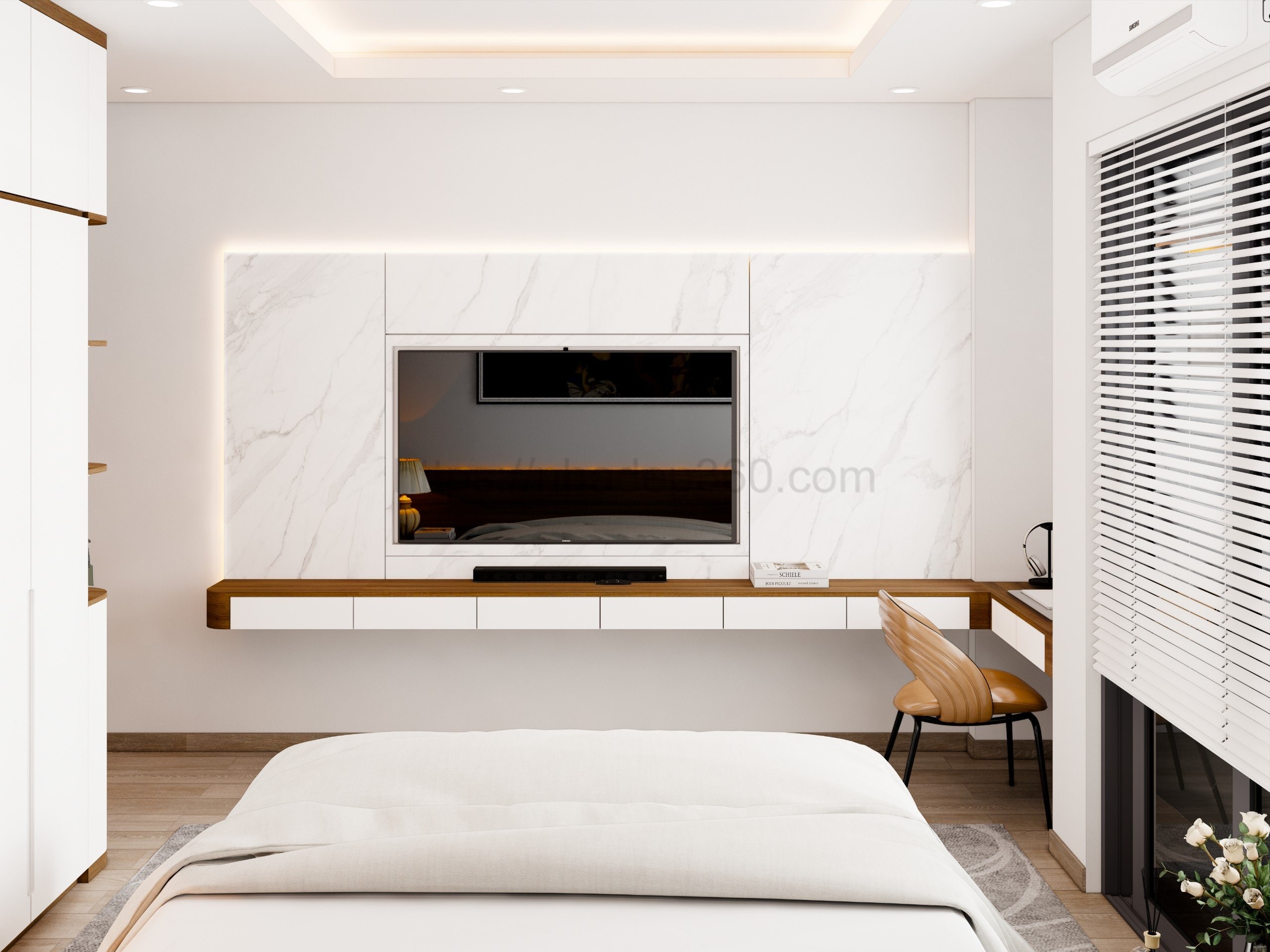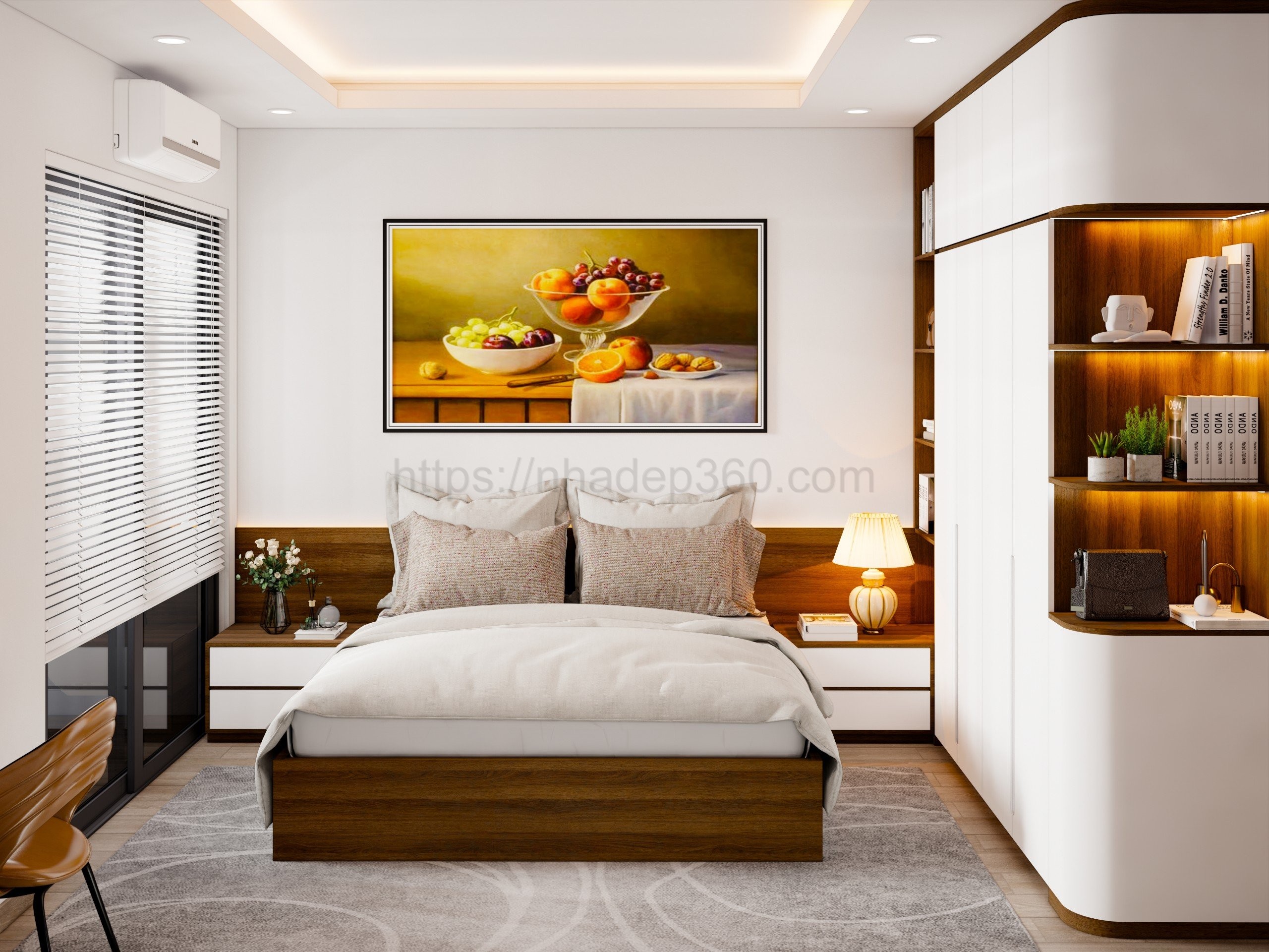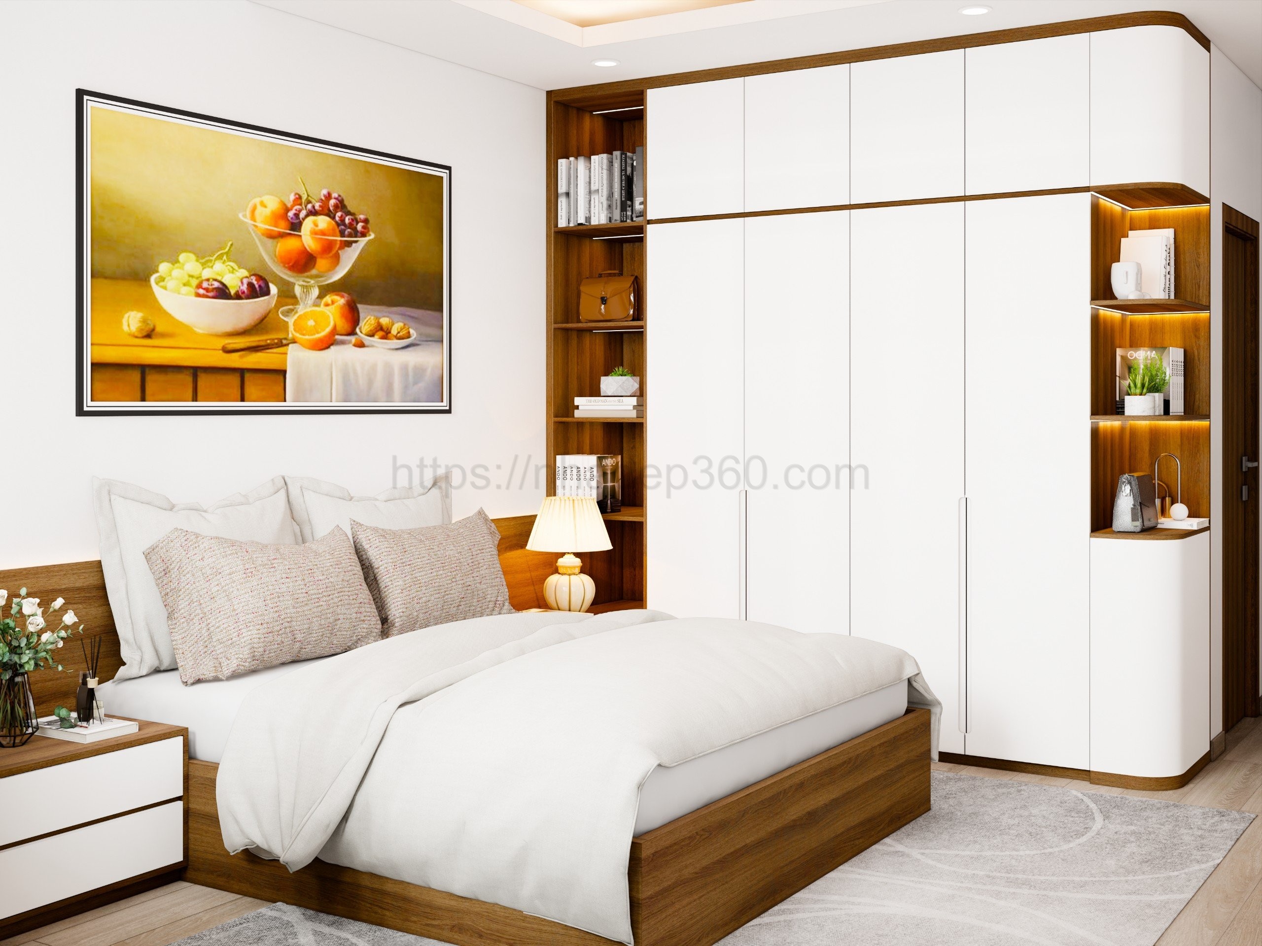 Ý tưởng: nhadep360.com thiết kế nội thất căn hộ 90m2 với phong cách Hiện đại, tông màu trắng sáng và gỗ sáng màu tạo nên không gian tinh tế, thoáng đãng và ấm áp. Sự kết hợp giữa đồ nội thất tối giản và các chất liệu như kim loại, kính, và gỗ tự nhiên mang lại vẻ đẹp hiện đại và gần gũi.
